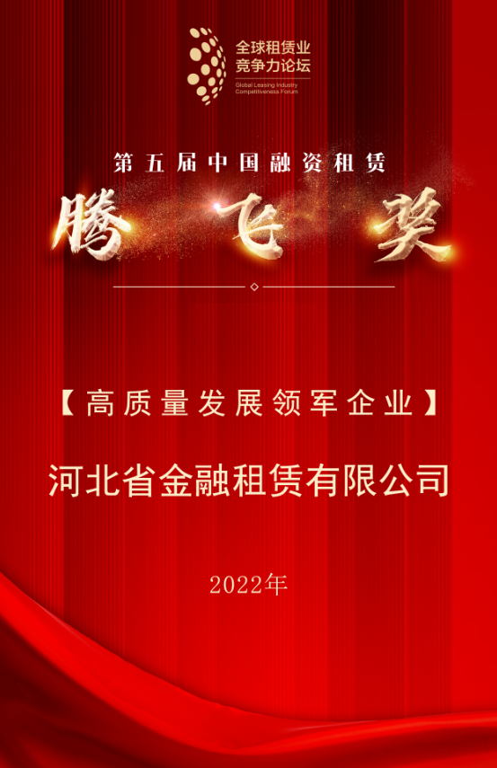 日前,第九屆全球租賃業(yè)競爭力論壇年度峰會圓滿召開,河北省金融租賃有限公司(以下簡稱“河北金租”或“公司”)再度攬下中國融資租賃“騰飛獎(jiǎng)”,榮獲“高質(zhì)量發(fā)展領(lǐng)軍企業(yè)”榮譽(yù)。