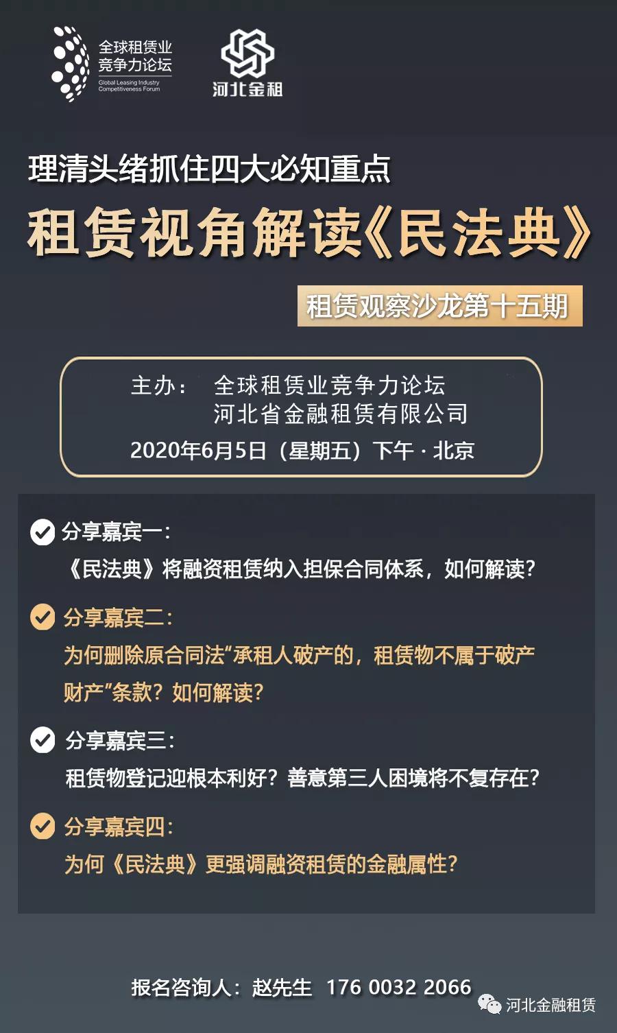 6月5日下午,全球租賃業(yè)競爭力論壇與河北省金融租賃有限公司將在北京聯(lián)合主辦“租賃視角解讀《民法典》”研討會(huì),本次研討會(huì)邀請了融資租賃專業(yè)法庭法官,金融租賃公司、融資租賃公司法務(wù)總監(jiān),律師事務(wù)所主任律師等資深業(yè)內(nèi)人士參會(huì),共同研討和分享《民法典》實(shí)施后對融資租賃的經(jīng)營影響,租賃公司如何做好準(zhǔn)備主動(dòng)應(yīng)對等主題,