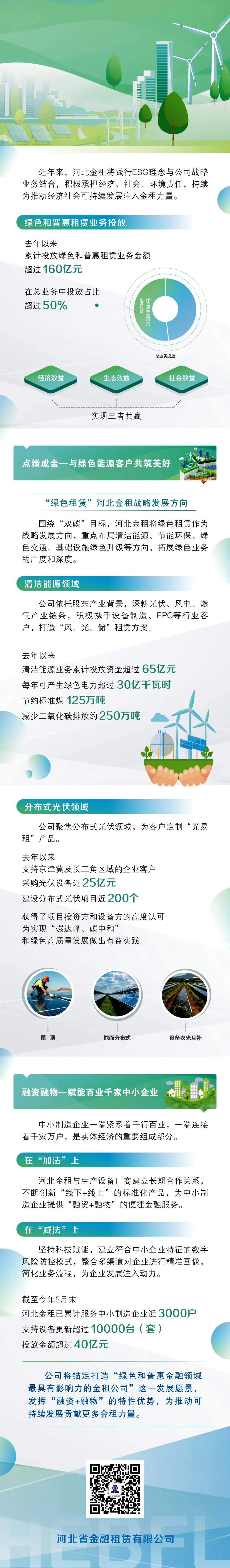 圍繞“雙碳”目標,河北金租將綠色租賃作為戰(zhàn)略發(fā)展方向,重點布局清潔能源、節(jié)能環(huán)保、綠色交通、基礎設施綠色升級等方向,拓展綠色業(yè)務的廣度和深度。